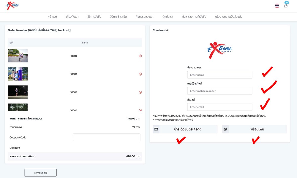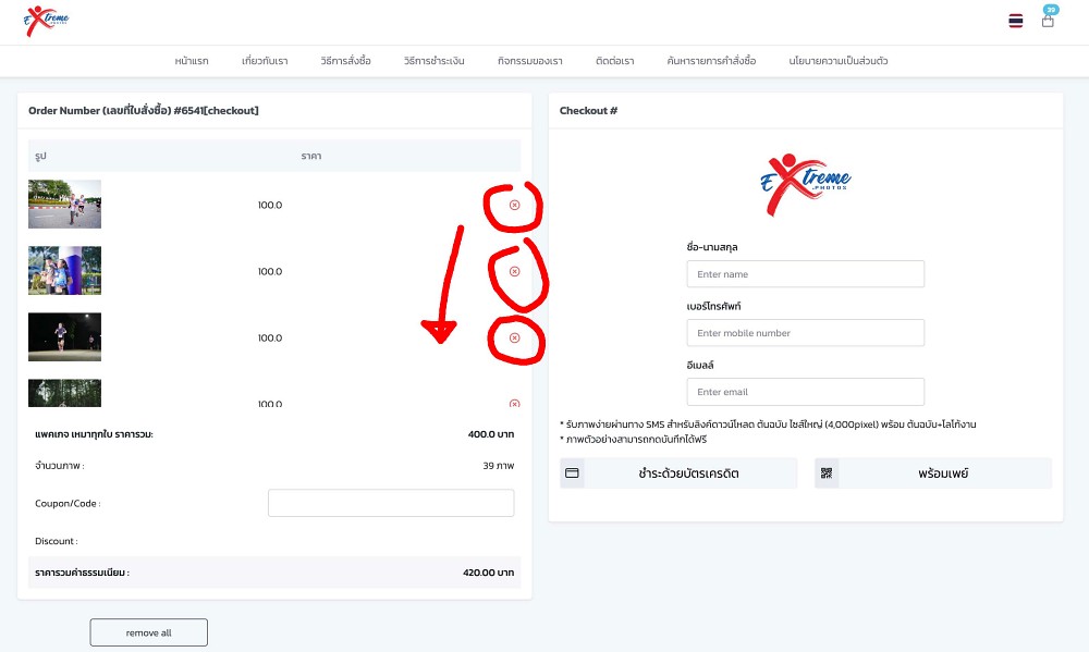 กรณีไม่เหมาและเลือกรูป หรือกดกากะบาทเพื่อลบรูปที่ไม่ต้องการเลือก ระบบจะคำนวนจำนวนภาพและราคาให้ เมื่อเลือกจนครบที่ต้องการกรอก